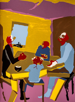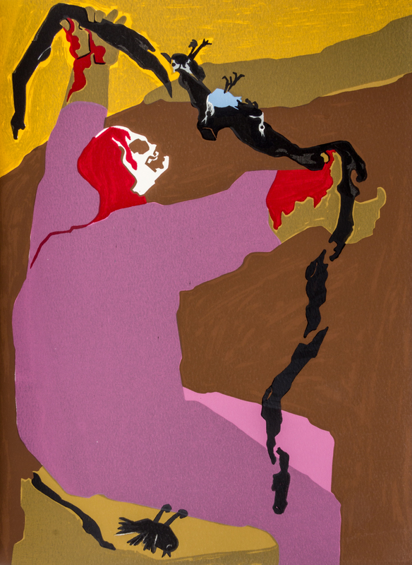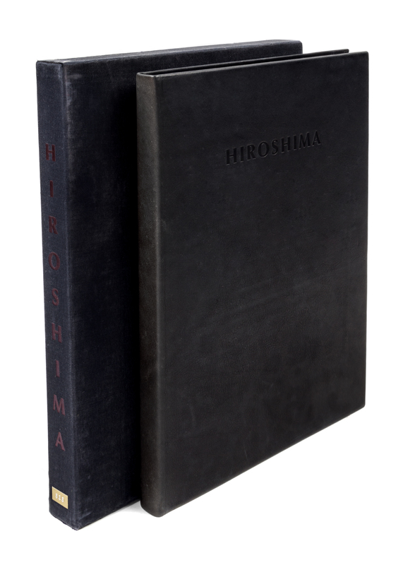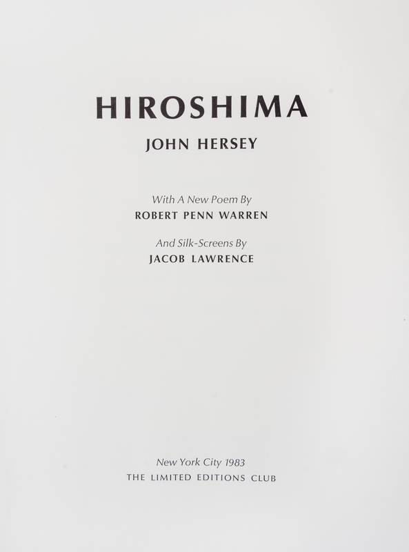 Hiroshima.New York: Limited Editions Club, 1983.Black aniline leather binding (33 cm. tall). With eight original color screenprints by Lawrence. Number 988 of 1,500, signed by John Hersey, Robert Penn Warren, and Lawrence on the justification page. With minor sunning to spine; edge-wear to slipcase.