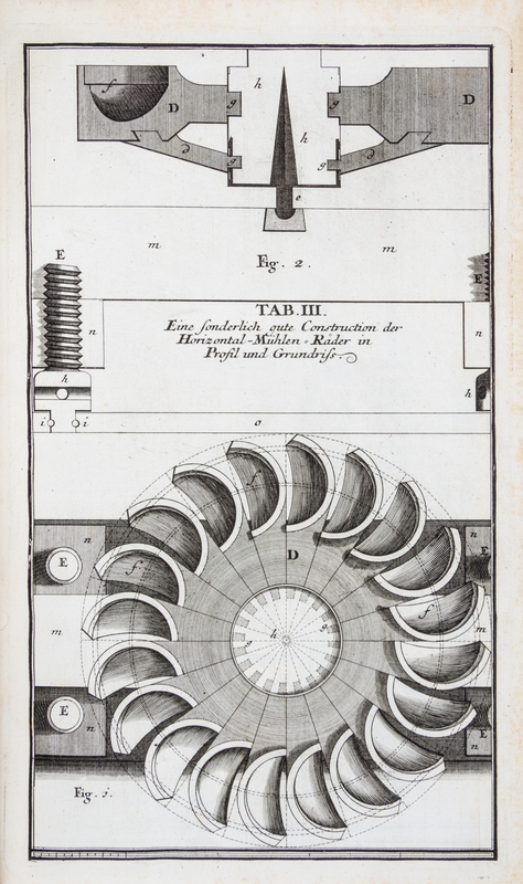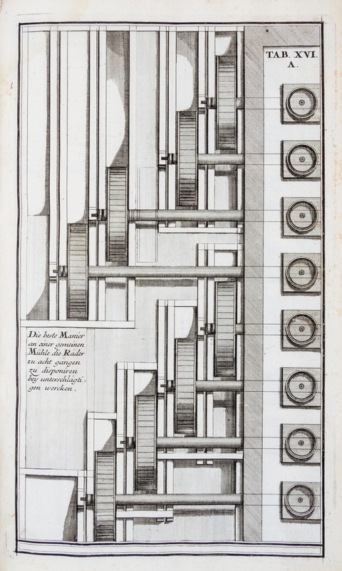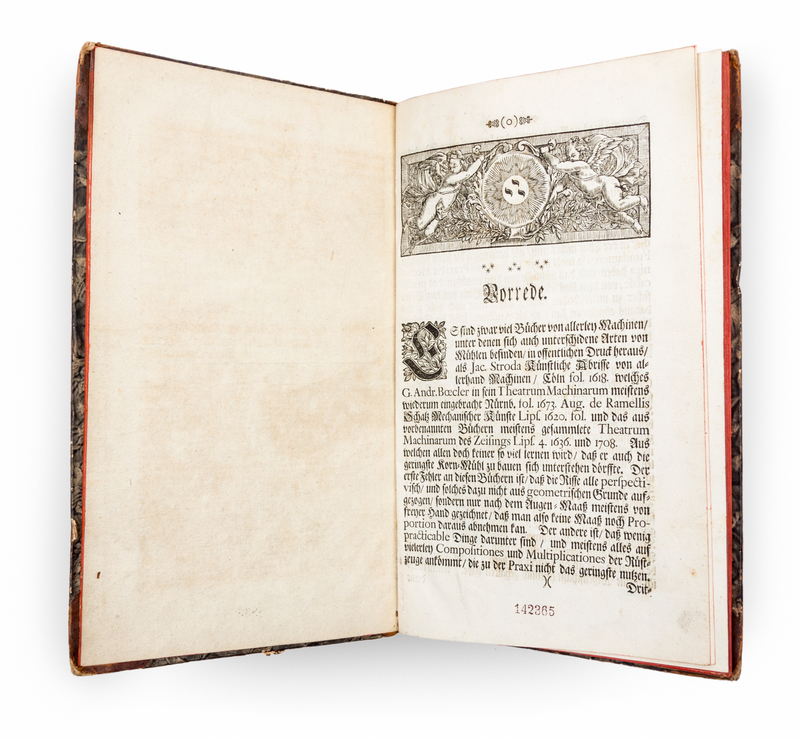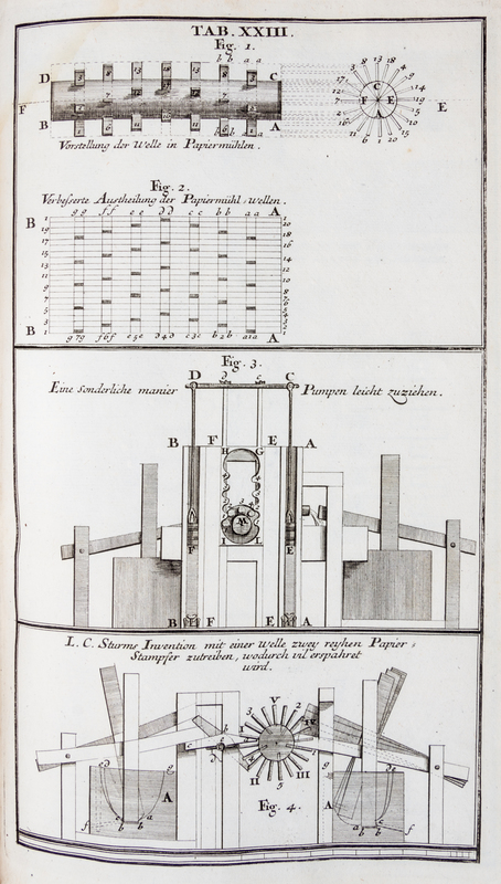 Vollstandige muhlen baukunst .... Augsburg: J. Wolff, 1718. First edition.Three-quarter leather over marbled boards (34 cm. tall); general wear, with some loss to spine and remnants of shelf-mark. Contemporary German library stamp to title page, with nineteenth century German bokseller's ticket to front pastedown. Engraved title page. Contents collated as complete: 35, [1] pages of text in Gothic script, followed by 51 plates; remarkably bright.Treatise on mills and hydraulic machinery, with an early depiction of the paper-making process.