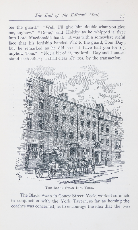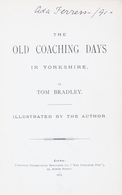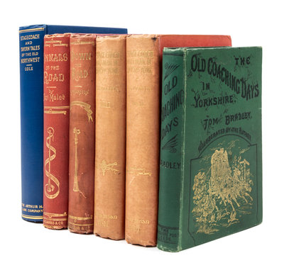A group of six works on stage coaching, including: (1) Tom Bradley, The old coaching days in Yorkshire. Leeds: Yorkshire Conservative Newspaper Company, 1889; (2) Birch Reynardson, Down the road or reminiscences of a gentleman coachman. London: Longmans, Green and Company, n.d; (3) Captain H. E. Malet, Annals of the road or notes on mail and stage coaching in Great Britan. London: Longmans, Green and Company, 1876; (4) Charles G. Harper, Stage-coach and mail in days of yore: a picturesque history of the coaching age. London: Chapman and Hall, 1903 (two volumes); and (5) Harry Ellesworth Cole, Stagecoach and tavern tales of the old Northwest. Cleveland: The Arthur H. Clark Comapny, 1930.