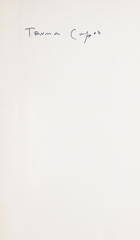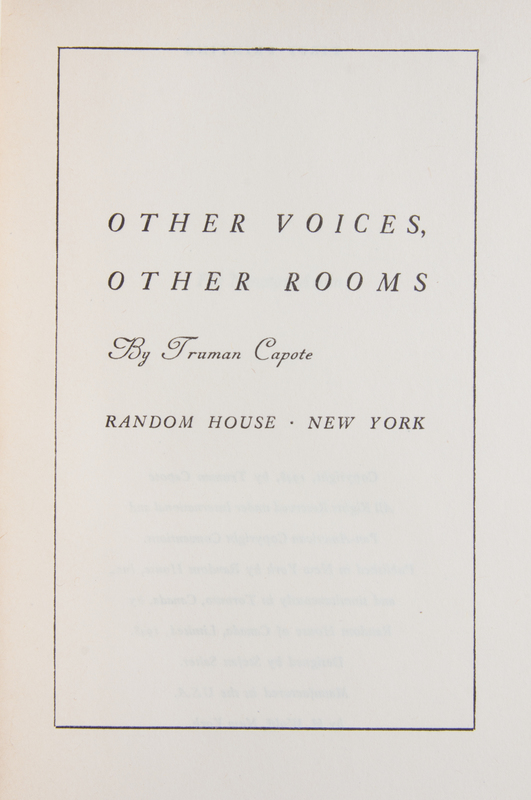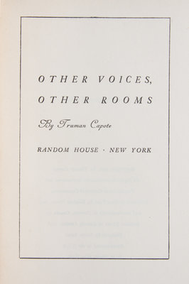 Other Voices Other Rooms. New York: Random House, 1948.First edition. Signed by the author on the f.f.e.p. Tan cloth boards (21 cm tall), with printed dust jacket. Lightly toned.