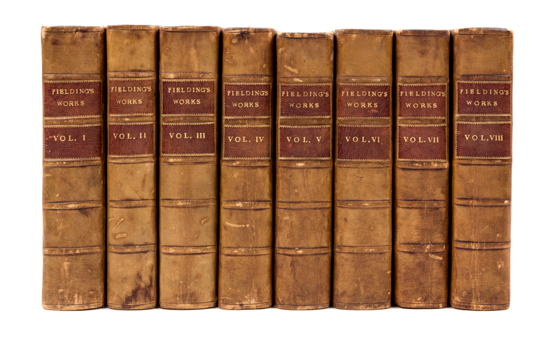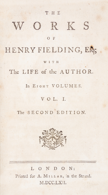 The Works of Henry Fielding, Esq.. With the Life of the Author. London: A. Millar, 1762.8 vols. Contemporary calf (21 cm tall) rebacked in period style, gilt-lettered red leather spine labels. Second edition, issued simultaneously with the "first," with engraved portrait of Basire after Hogarth to vol. 1. Boards rubbed and corners bumped; minor intermittent foxing and a few marginal ink stains; endpaper toned; bookplates tipped in front pastedowns: D. Garnett.