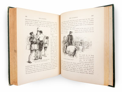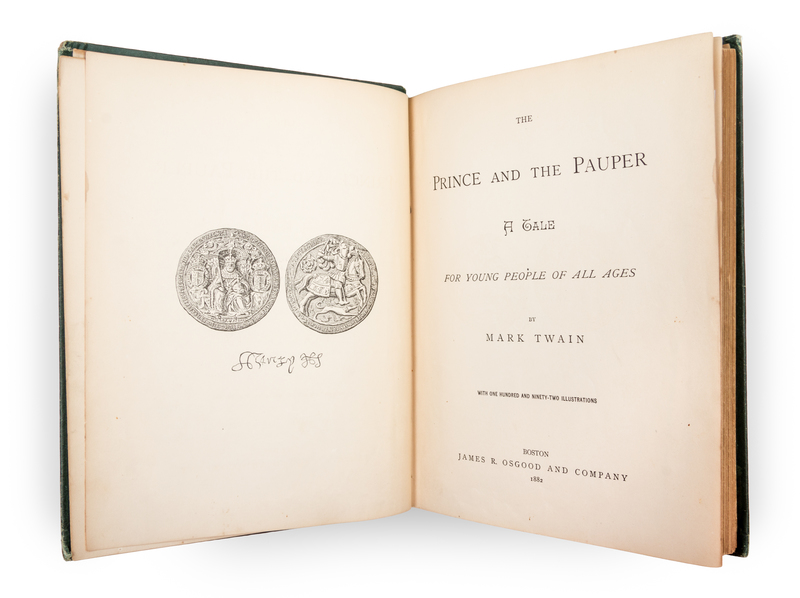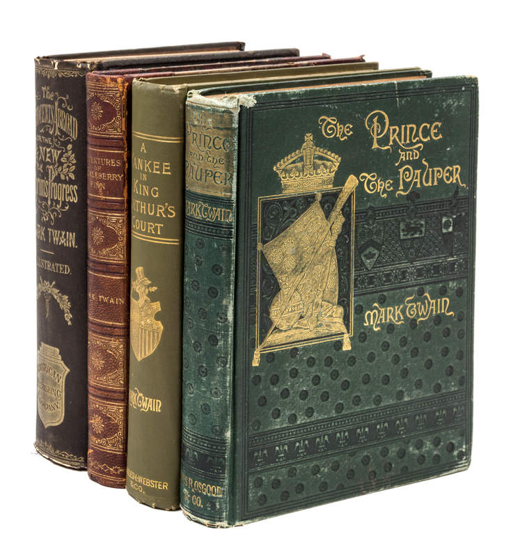 Collection of four works by Mark Twain consisting of (1) Connecticut Yankee in King Arthur's Court. New York: Webster, 1889. Original publisher's cloth. First edition, second issue. Inner hinges are weakened; (2) Adventures of Huckleberry Finn. New York: Webster, 1885. Three quarter leather binding. First edition. Contains numerous in-text llustrations after E. W. Kemble and a photogravure of Karl Gerhardt's portrait bust of Clemens (here without tablecloth visible). Of the three changes introduced after the first printing of 30,000, they are present here in the first and uncorrected state. Those changes are at p. 13 the erroneous page reference "88" was changed to "87"; at p. 57 the misprint "with the was" was corrected to "with the saw"; and at p. 9 the misprint "Decided" was corrected to "Decides". Of the traditional issue points, this copy has p. 155 with the final 5 lacking, and the suggestive illustration on page 283 has been modified. Previous owner's name stamped several times on the front endpapers; (3) Prince and the Pauper. Boston: Osgood, 1882. Original publisher's green cloth, lettered and decorated in black and gilt. First American edition with the Franklin Press imprint on the copyright page and correct number of blank leaves. Red pencil annotation on copyright page, and a few pages with tiny stains; (4) Innocents Abroad. Hartford: American, 1870. First edition, second or mixed issue. Original publisher's cloth with stamped gilt lettering and ornamentation to the spine and front cover. Identification points: Page numbers are given in the "Contents" and last entry on p. xviii reads "Thankless Devotion - A Newspaper Valedictory - Conclusion." This edition has the engraved portrait of Napoleon III on p. 129. Heading on p. 643 is "Chapter LXI". Advertisement for "Personal History of Ulysses S. Grant" appears on the fourth page of advertisements. Edgewear; corners rubbed and bumped; light foxing to endpapers.