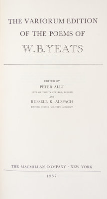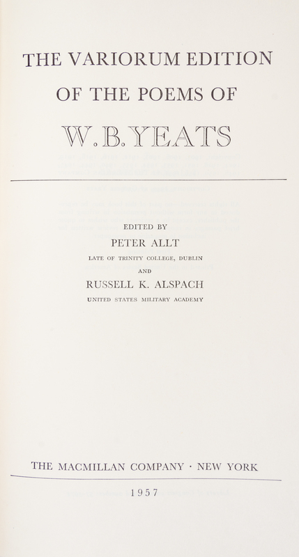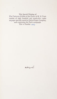 The variorum edition of the poems of W. B. Yeats. New York: The Macmillan Company, 1957. Signed by the author on the limitation page. Publisher's cloth boards (24cm tall) with gilt lettering at spine, slipcase. Limited edition number 449 of 825. Toning to slipcase; light sunning to spine; otherwise fine condition.