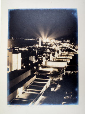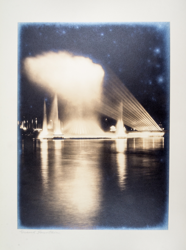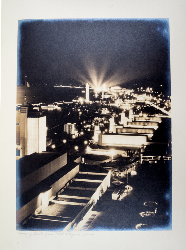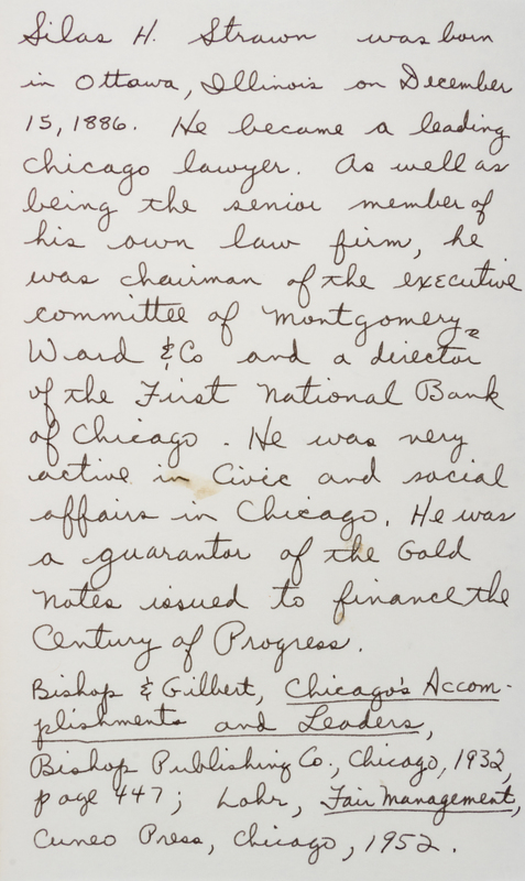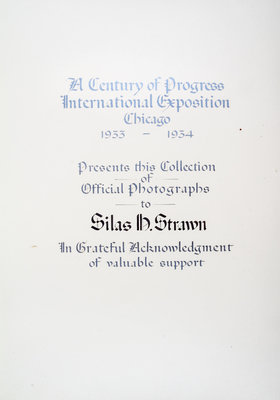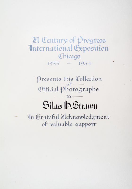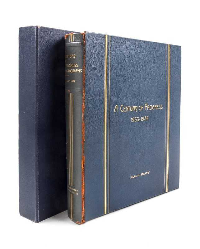 A Century of Progress International Exposition, Chicago, 1933-1934. Chicago: Kaufman-Fabry Photographers, n.d. (c. 1934). Full blue pebbled leather, (36 cm tall), gilt-decorative spine, silk endpapers, slipcase. Album of photographs of the Century of Progress fairgrounds. Presentation copy to Silas H. Strawn, Chairman of the Executive Committee of Montgomery Ward and a guarantor of gold notes issued to finance the Century of Progress. (Bishop & Gilbert, Chicago's Accomplishments and Leaders, 1932). Upper board detached; some spotting to photographs; slipcase worn and separating.