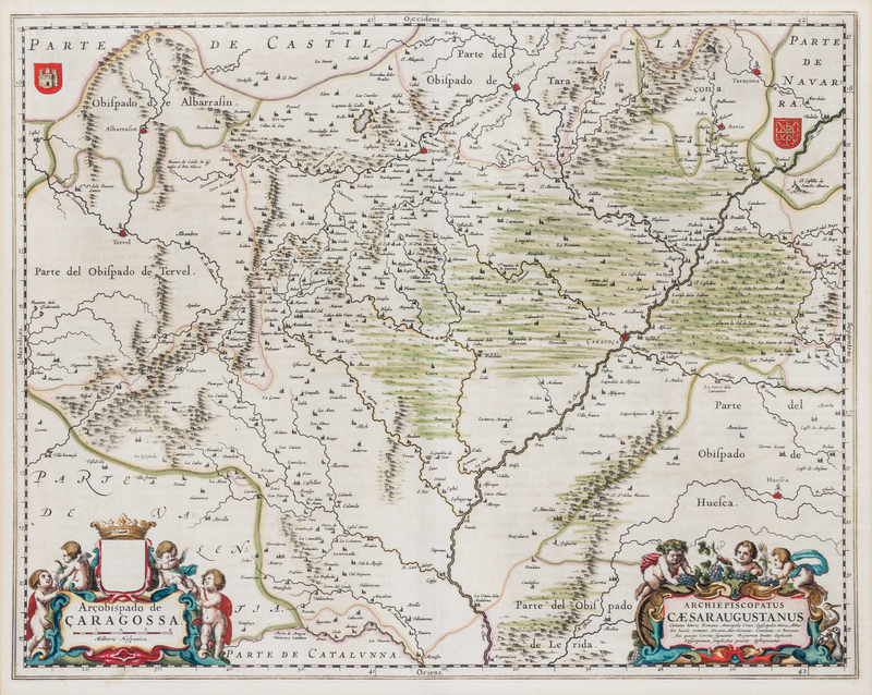 Arobispado de Caragossa. [Amsterdam]: [1664].Hand-colored engraved ecclesiastical map depicting the Zaragoza region of Spain. Framed and matted. (Sight: 44 x 54 cm.)