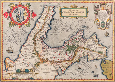 Itala nam tellus GRAECIA MAJOR erat. Ovid 4. Fast. [Amsterdam], c.1600.Hand- colored engraved map depicting the part of Italy that was formerly called Graecia Major or Magna Graecia i.e the "foot" of the Italian boot reaching up to Paestum south of Naples. Seen from the West. All names in Latin. With three cartouches one of which contains a special map of the so-called "Diomedeae" Islands off the coast of Mount Gargano in Apulia. Framed and matted. (34 x 48 cm.)