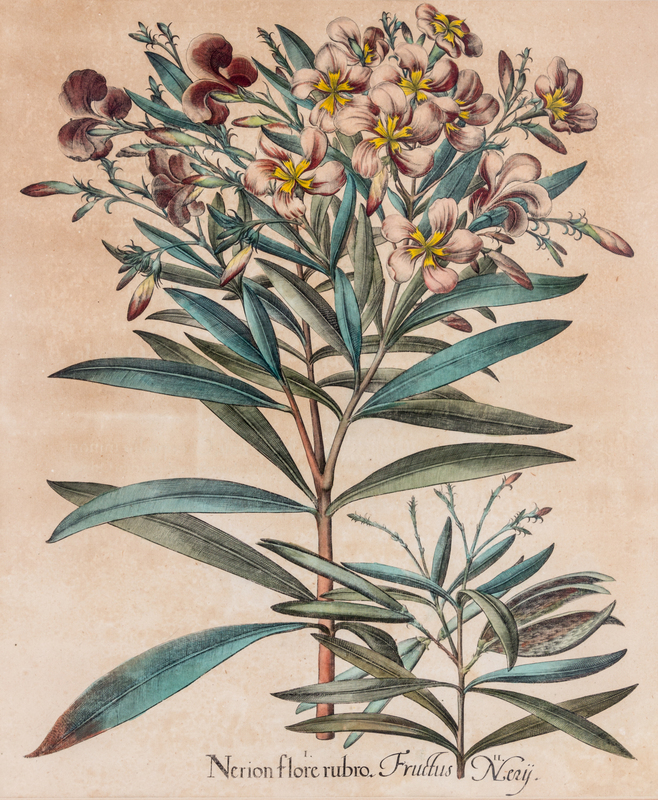 I. Nerion flore rubro, II. Fructus Nery. Hand-colored engraving from Hortus Eystettensis. Nurenberg, c.1620. Framed and matted. (Sight: 47 x 30 cm). Paper toned; minor cockling at lower edge.