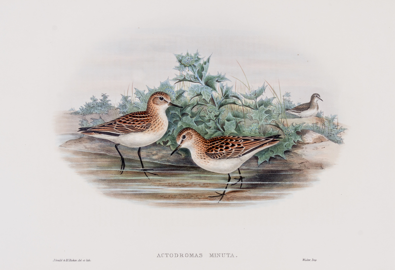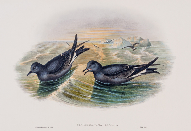 Group of two prints consisting of Thalassidroma Leachii, Fork-tailed Storm-petrel. [Together with] Actodromas Minuta, Little Stint. Both are hand-colored lithographs fromThe Birds of Great Britain, c.1863. Binding marks along bottom edges of both prints, otherwise fine condition.