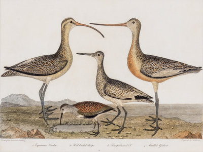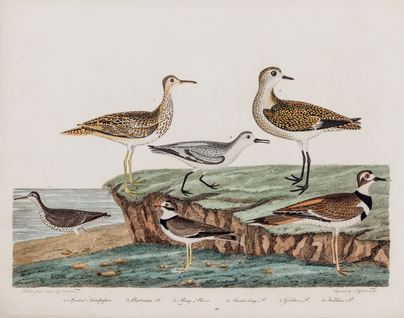 Ring Plover, Golden Plover, Spotted Sandpiper, plate 59. Copper engraving with hand-coloring from American Ornithology, Philadelphia 1808-1814. Small losses to top left and lower right corner; lightly toned; lined with Japanese tissue. [Together with] Red Backed Snipe, plate 56. Copper engraving with hand-coloring from American Ornithology, Philadelphia 1808-1814. All are matted. All in fine condition. Both matted. Light toning to paper; binding holes noted at bottom. (Size of largest: 28.5 x 37 cm.)