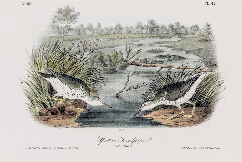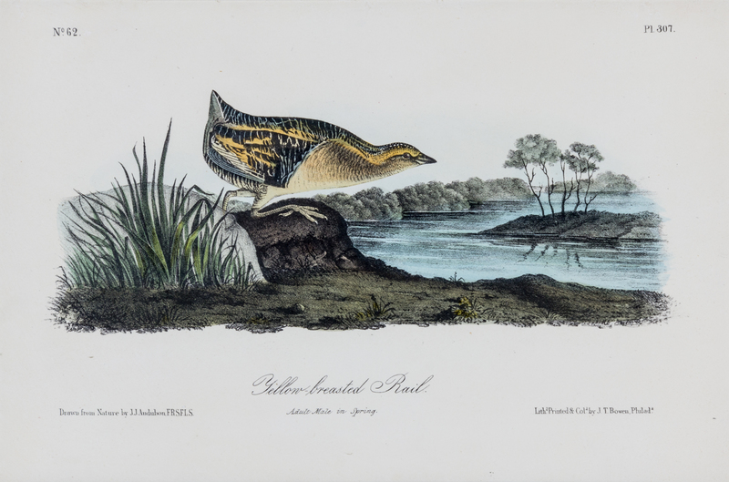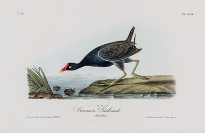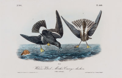 Group of four hand-colored lithographic prints (17 x 27 cm.) from the octavo edition of The birds of America, c. 1839. Consisting of: (1) Wilson's Petrel --Mother Carrey's chicken, plate 460, no. 92; (2) Common Gallinule, plate 304, no. 61; (3) Spotted Sandpiper, plate 342, no. 69; and (4) Yellow-breasted Rail, plate 307, no. 62. All are matted and in fine condition.