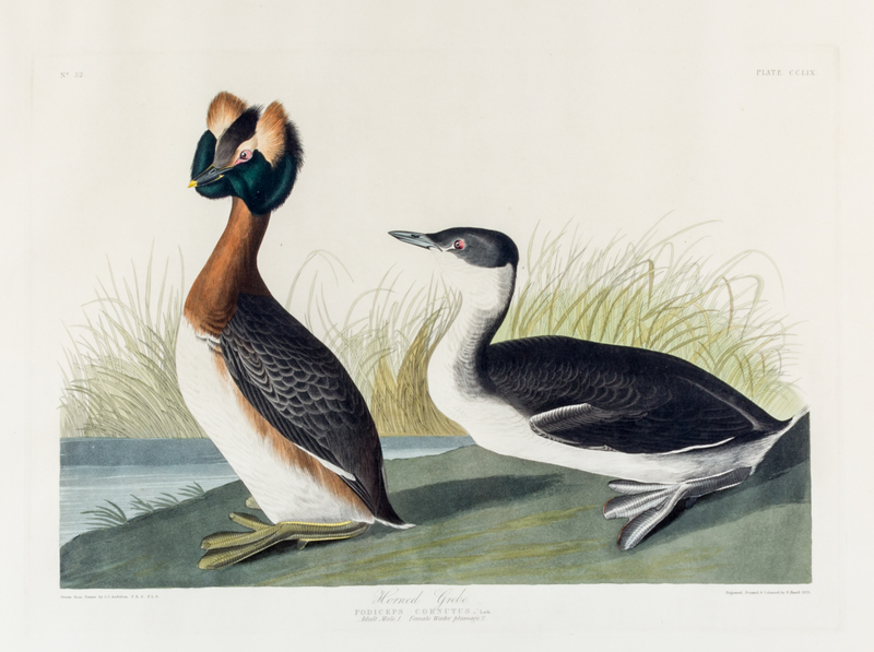 Horned Grebe, Podiceps Comnitus, plate CCLIX. Engraving (58 x 70 cm.), with etching, aquatint, and hand-coloring, from The birds of America, 1827.