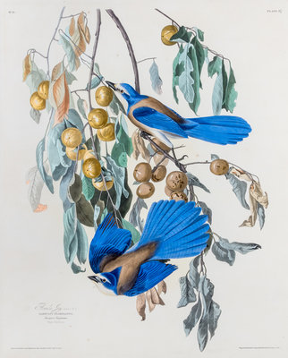 Florida Jay, Garrulus Floridianus, plate 87, no.18. Engraving (sheet size 38 x 25 1/2 inches plate size 26 x 20 3/3 inches), with etching, aquatint, and hand-coloring from The birds of America, J. Whatman 1830. Matted and framed.