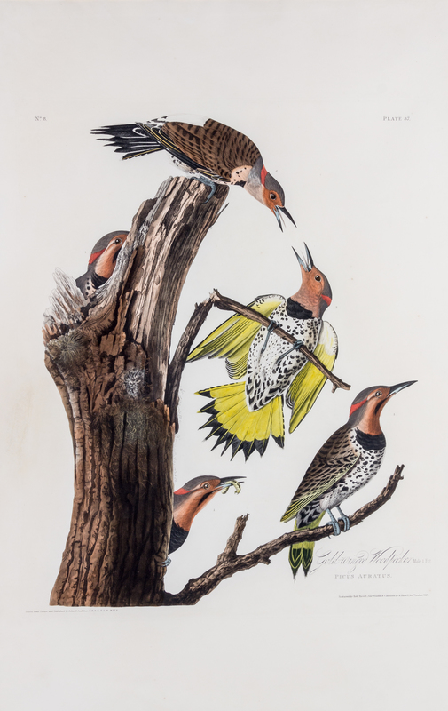 Gold Winged Woodpecker, Picus Auratus, plate 37, no. 8. Engraving with etching, aquatint, and hand-coloring from The birds of America, J. Whatman, 1826. Framed and matted. Sheet size 38 x 25 inches. Plate size 25 1/2 x 20 1/2 inches.