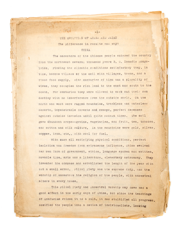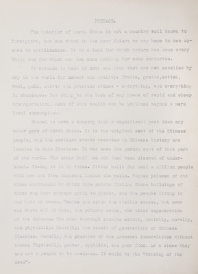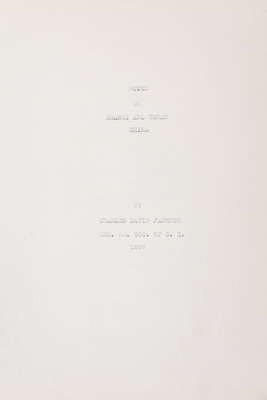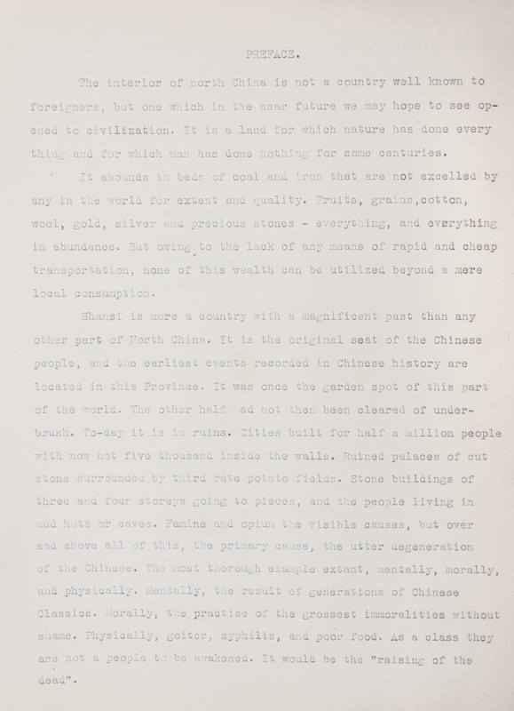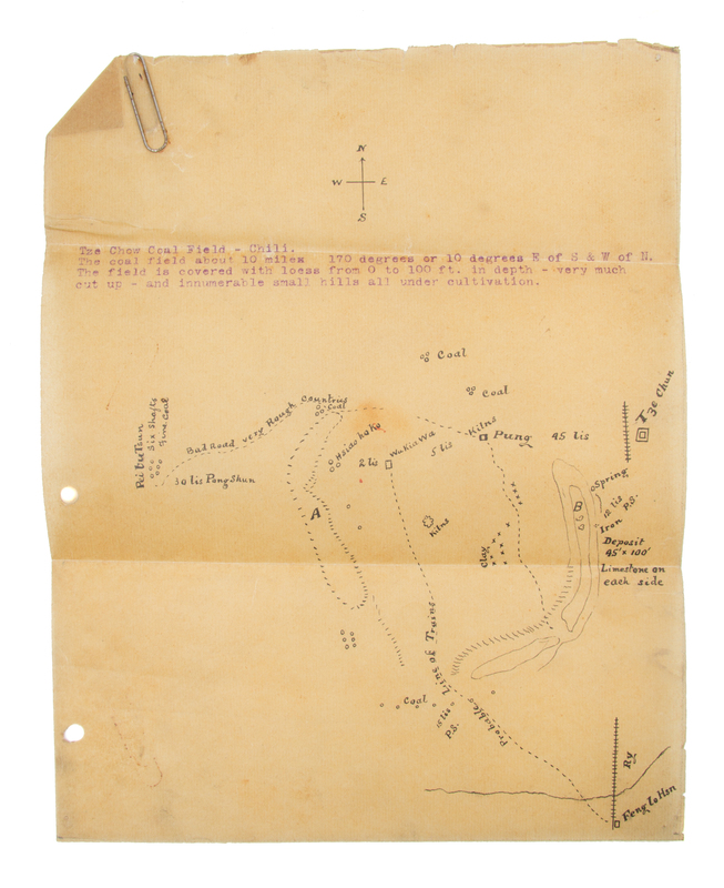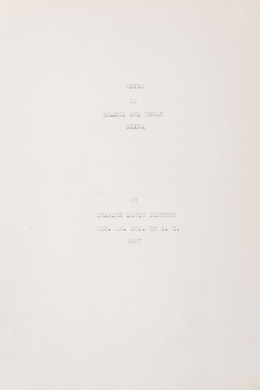 An archive of photographic, manuscript, and printed materials from Charles Davis Jameson, an American engineer who worked in China at the close of the nineteenth century.Cultural materials include the 102 page typescript "Notes in Shansi and Honan China" (dated 1897), in which Jameson offers amateur anthropological pronouncements, as well as the typescript entitled "The evolution of China and Japan: the difference in results and why?" (undated; incomplete fragment of 9 pages).Original engineering-related materials include typescripts of two reports by Jameson on Chinese coal mines (Lin Tcheng and Tse Chow), with illustrated maps and details about labour conditions for miners, and a copy of Jameson's 1919 report to the Chinese Government Railways on the Chouchiakou-Hsiangyang Line, comprising 43 mimoegraphed pages, with 2 fold-out maps, and illustrated with 71 photographs (unrecorded by OCLC). Personal materials include a series of diaries (1903, 1906, 1910, 1917), with hundreds of manuscript entries; a commonplace book of approximately 60 pages, mostly filled with poetry; and a 10 page autograph letter to Jameson's mother (1911).Photographic materials include a large photo album, partially captioned, with 386 photographic prints of rural China; a leporello album with 24 colorized photographs; five loose photographs pasted to boards, of a Chinese monk with weapons (reproducing images found in other albums). With 15 further albums (circa 1895-1913), housing over 800 photographs documenting landscape, engineering projects, Chinese people, British royalty, and the domestic life of ex-pat Westerners.Condition note: portions of the archive have sustained damp-staining and many of the photographs have sustained some degree of fading.