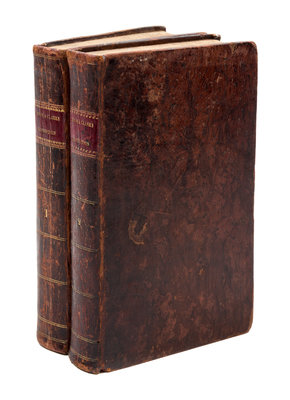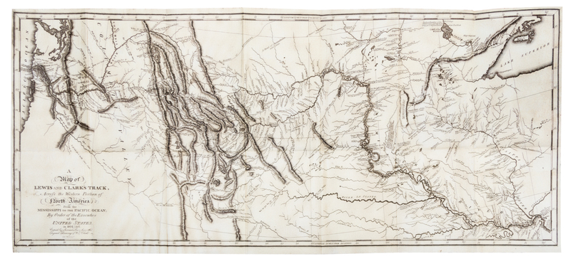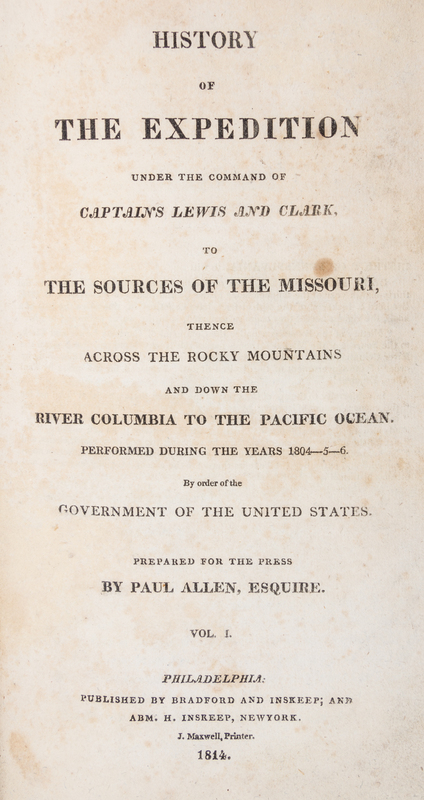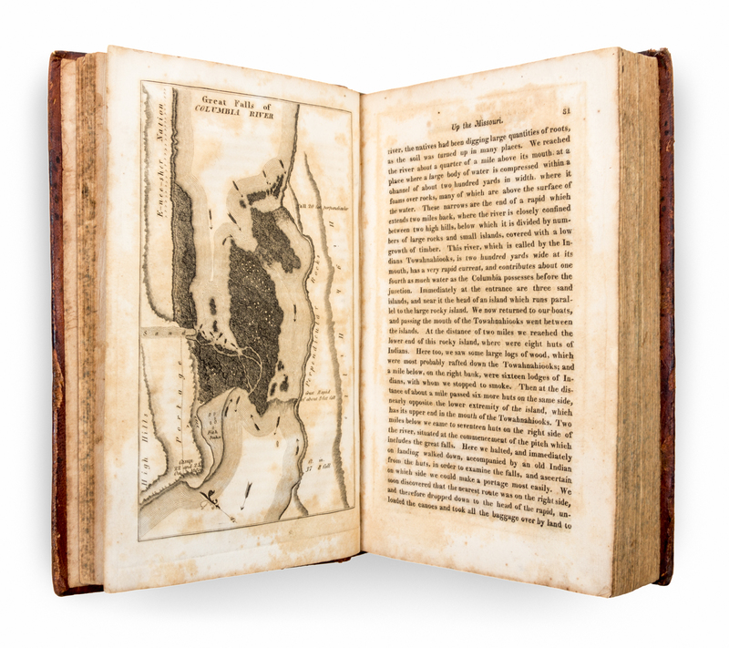 History of the expedition under the command of Captains Lewis and Clark, to the sources of the Mississippi, thence across the Rocky Mountains and down the River Columbia to the Pacific Ocean. Performed during the years 1804-5-6. By the order of the Government of the United States. Philadelphia: Bradford and Inskeep and Abm. H. Inskeep of New York, 1814. First edition, with folding map in expert facsimile.Two volumes. Full leather boards (22 cm. tall), with simple gilt ruling to spine; gilt lettering to red leather compartment. Contents foxed. With ownership inscription to title page of second volume. Illustrated with five maps and charts. The large folding map is supplied in expert facsimile.Covering some eight thousand miles in slightly more than twenty-eight months, Lewis and Clark retrieved the first reliable information concerning the areas acquired in the Louisiana Purchase.