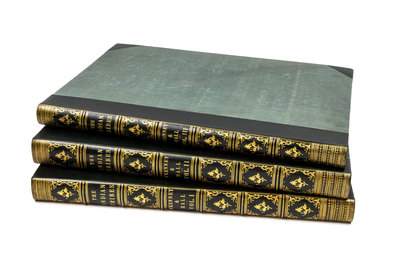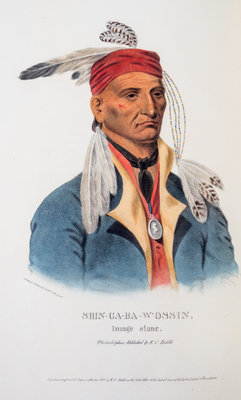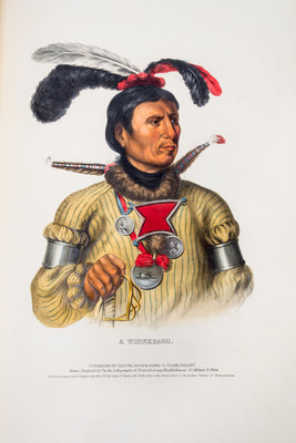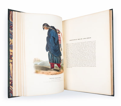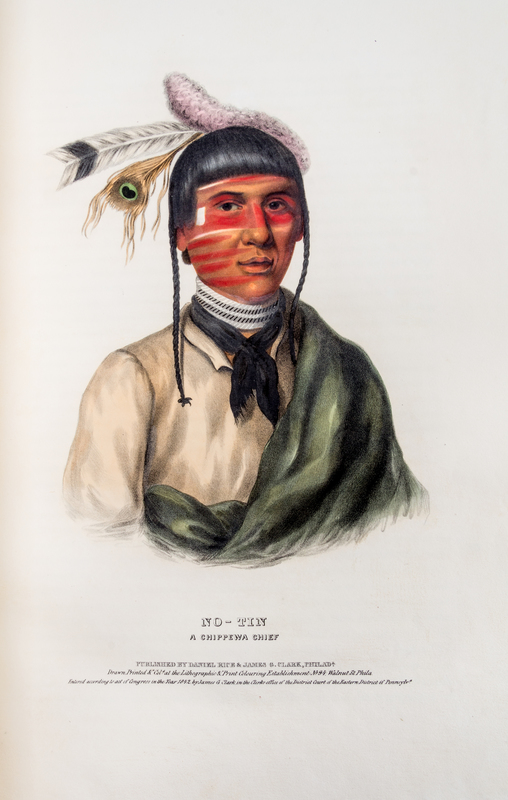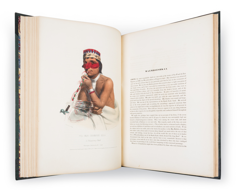 History of the Indian tribes of North America, with biographical sketches and anecdotes of the principal chiefs. Embellished with one hundred and twenty portraits from the Indian gallery in the Department of War, at Washington. Philadelphia: Edward C. Biddle, 1836 (volume I) / Daniel Rice and James G. Clark, 1842 (volume II, second issue) and 1844 (volume III).Three volume set, green morocco over period green moire cloth-covered boards (52 cm. tall). Spine with raised bands in seven compartments, lettered in the second and fourth; the others with a repeat decoration in gilt. Illustrated with 120 hand-colored lithographic plates after Karl Bodmer, Charles Bird King, James Otto Lewis, P. Rhindesbacher, and R. M. Sully, drawn on stone by A. Newsam, A. Hoffy, Ralph Trembley, Henry Dacre and others, and printed and colored by J. T. Bowen and others. Volume III features two lithographic maps and one table printed on the recto of one leaf; with 17 pages of lithographic facsimile signtuares of the original subscribers.When President Jackson dismissed him from his position as Superintendent of Indian Trade, Thomas McKenney was able to turn his attention towards the documentation of a rapidly disappearing culture, soon joined by the Illinois journalist-lawyer-banker James Hall. Their text, including both individual biographies and a general history of the indigenous peoples of North America, has become famed for its colored portraits, which included faithful copies of original oils by Charles Bird King; all but four of which were destroyed in the Smithsonian fire of 1865.