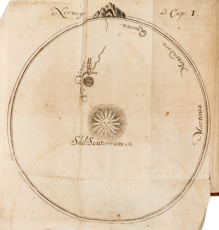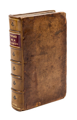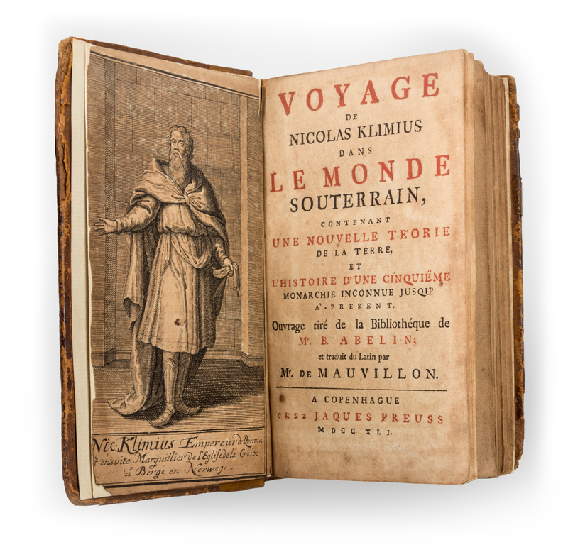 Voyage de Nicolas Klimius dans le monde souterrain, contenant une nouvelle teorie de la terre, et l'histoire d'une cinquieme monarchie inconnue jusqu'a present. Copenhagen: J. Preuss, 1741. French translation by Eleazar Mauvillon, from the Latin work of Baron Ludvig af Holberg.Contemporary leather boards (16 cm. tall), rebacked, with five raised bands and gilt lettering to red leather compartment. Illustrated with frontispiece and folding map. With nineteenth century annotations to rear endpaper (in English), providing biographical information about the otherwise anonymous author.Bleiler 1114: "Essentially a satire on European culture and institutions in the guise of an imaginary voyage;" one of the cultures especially satirized being the French.