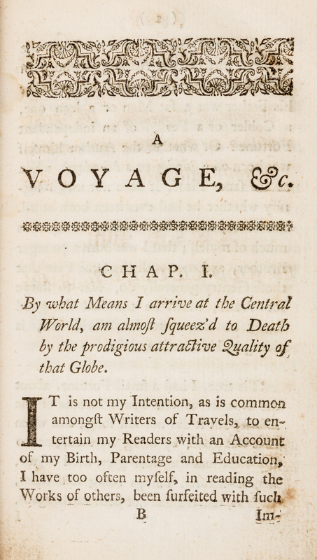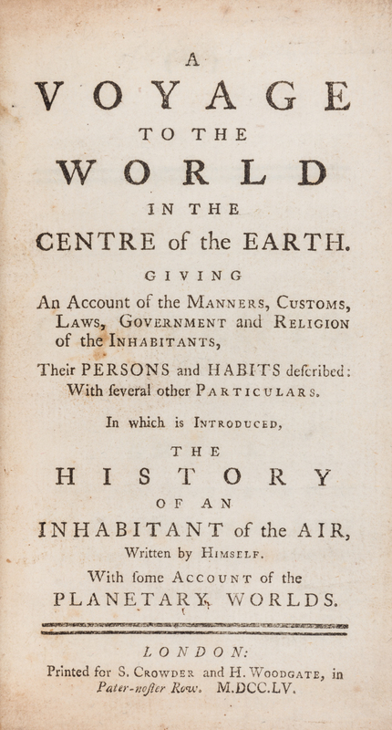 A voyage to the world in the centre of the Earth, giving an account of the manners, customs, laws, government, and religion of the inhabitants, their persons and habits described: with several other particulars: in which is introduced, the history of an inhabitant of the air. London: Printed for S. Crowder and H. Woodgate, 1755. Full leather boards (17 cm. tall), with inset and blind-stamped design. Five raised bands to spine, with gilt lettering to green leather compartment. Contents collated as complete, with xii, 275 numbered pages, followed by single page of advertisements. Bleiler 2273.