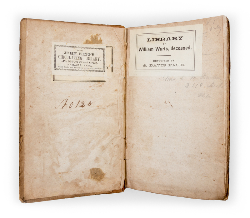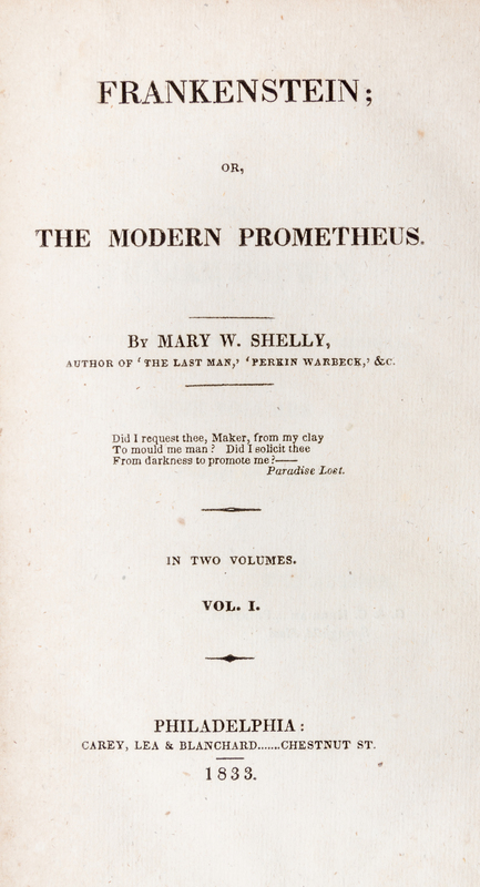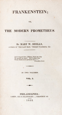 Frankenstein or, the modern Prometheus. Philadelphia: Carey, Lea and Blanchard, 1833. Another copy of the first American edition.Volume one only; featuring only a single leaf of ads bound at the beginning. With two bookplates to preliminaries; one for John King's Circulating Library in Philadelphia, the other from the library of William Wurts.