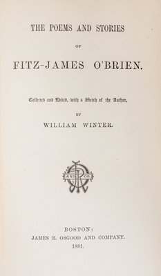 The poems and stories of Fitz-James O'Brien. Boston: James R. Osgood and Company, 1881.Blue cloth boards; spine somewhat sunned. With previous owner's bookplate to front pastedown and publishers ads at rear.