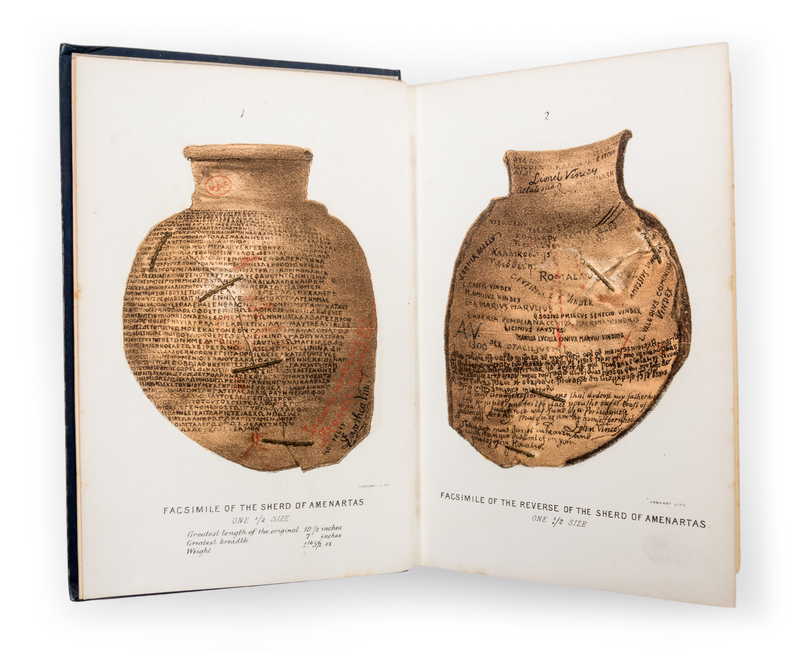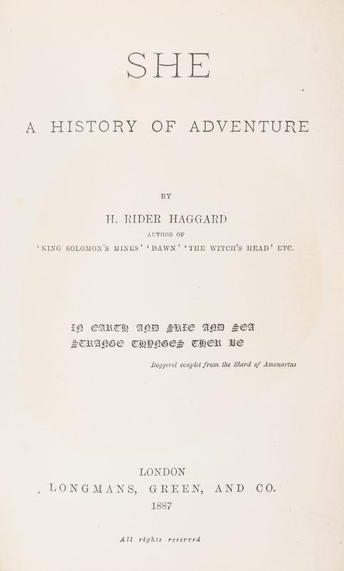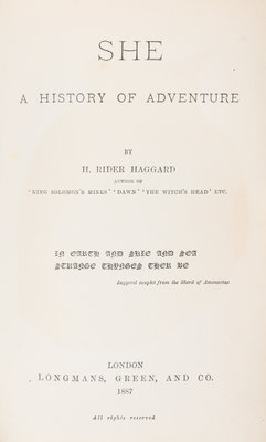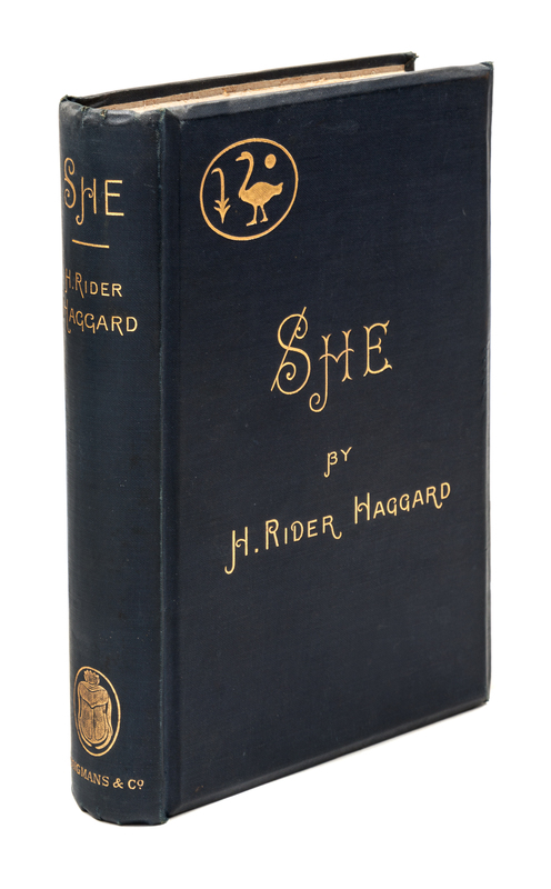 She: a history of adventure. London: Longmans, Green, and Co., 1887. First British edition (preceded by the American edition) edition, first printing with "Godness me" on p. 269.Decorative blue cloth boards. Spine slighty cocked, with both front and rear hinges starting.