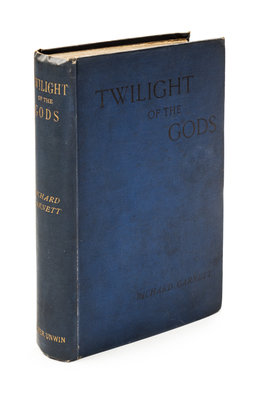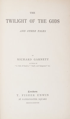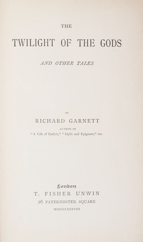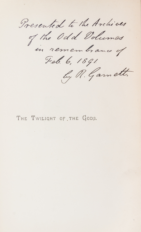 The twilight of the gods and other tales. London: T. Fisher Unwin, 1888. First edition, presentation copy.Cloth boards (20 cm.), lettered in black and gilt. Gatherings uncut. With 30 pages of advertisements bound to rear. A cryptic inscription from the author appears on half title-page: "Presented to the Archives of the Odd Volumes, in rememberance of Feb 6, 1891."