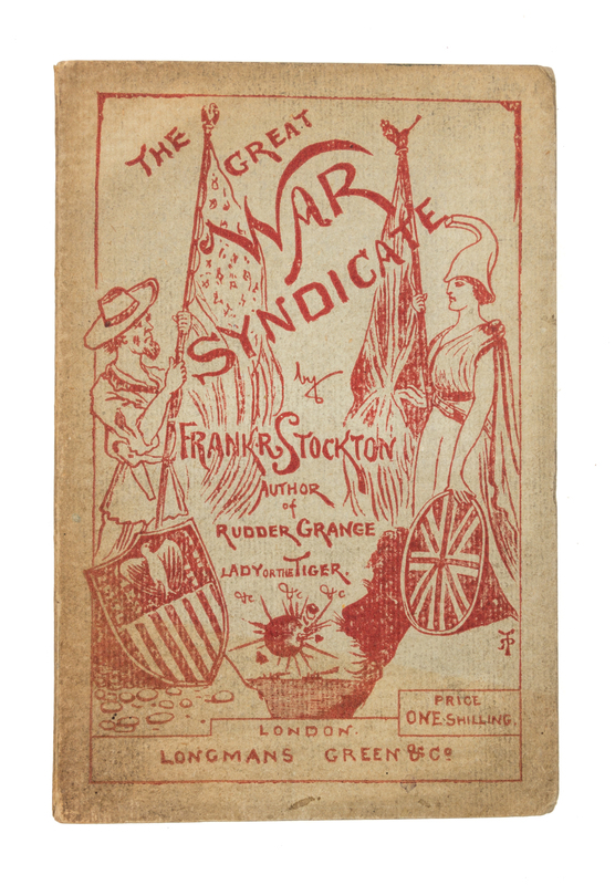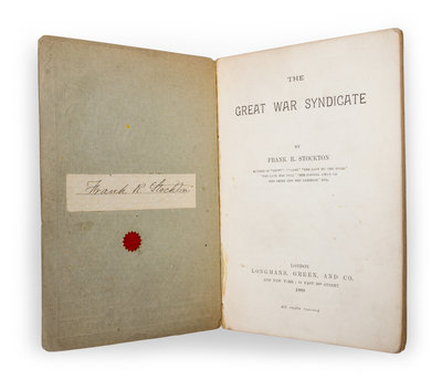 The great war syndicate. London: Longmans, Green, and Co., 1889. First edition, signed.Stiff illustrated wrappers (18 cm. tall); fresh, with slight bumping to corners. With author's clipped signature affixed to verso of front wrapper, above red star.