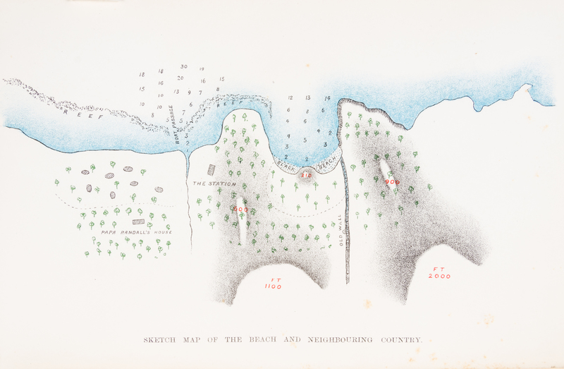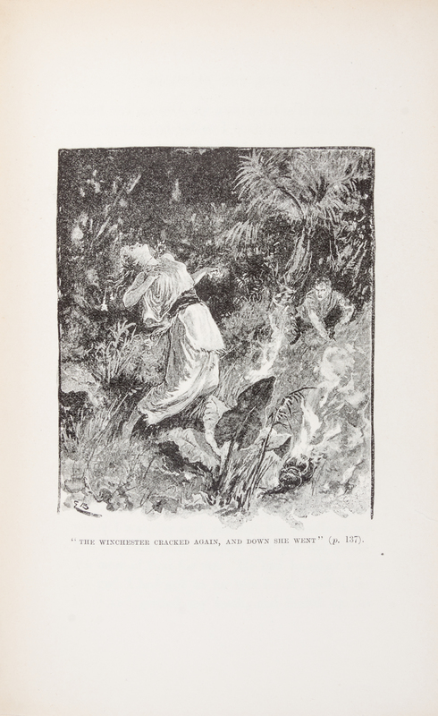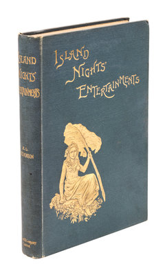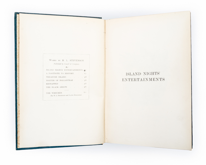 Island nights' entertainments, consisting of the Beach of Falsea, The bottle imp, The isle of voices. London: Cassell and Company, 1893. First edition, with hand-corrected price list facing half-title page. Green cloth boards (21 cm. tall), with gilt-stamped design and gilt lettering to front board and spine. Illustrated by Gordon Browne and W. Hatherell, with frontispiece, color map, and 26 black-and-white pages. With 16 pages of ads at rear.