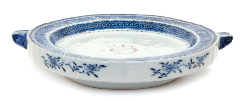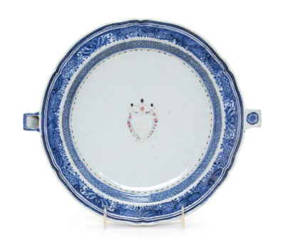 A Chinese Export Porcelain Blue and White Armorial Warming Tray