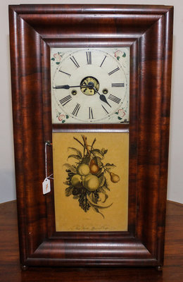 having rectangular case with ogee frame, the painted dial with Roman numerals, the lower panel decorated with fruit.