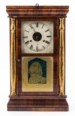 the circular dial with Roman numeral house set behind a glazed cover door, the lower panel depicting a hound and set in a rectangular case.