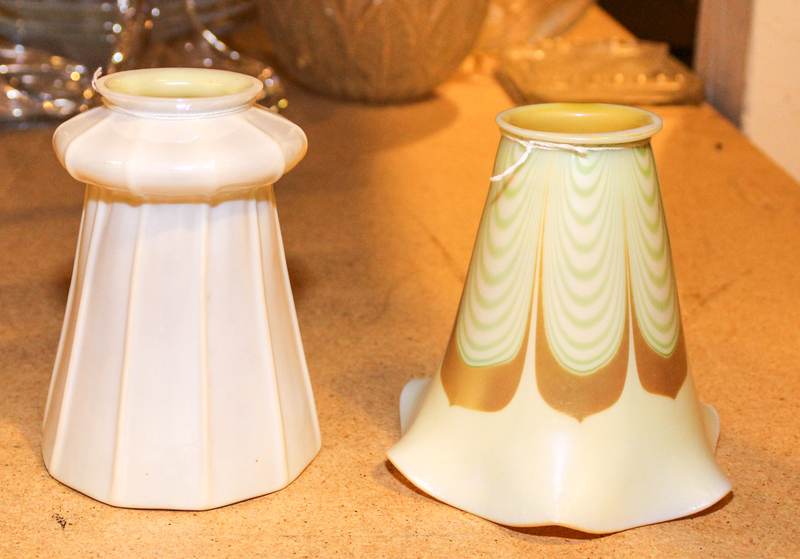 one with calcite ribbed exterior, the other with pulled feather decoration.