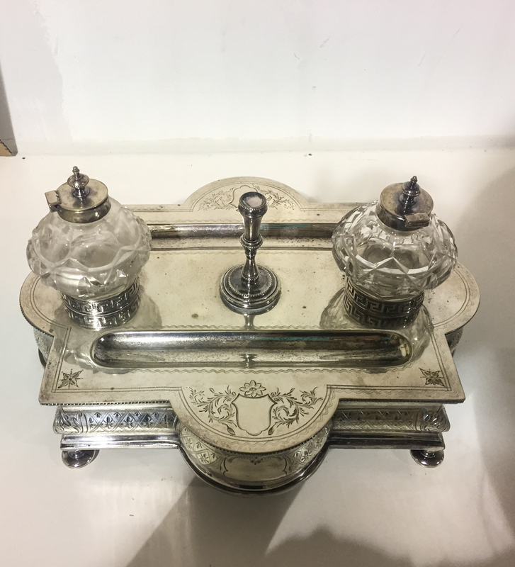 with cut glass ink pots and bright cut vines issuing from vacant cartouches.