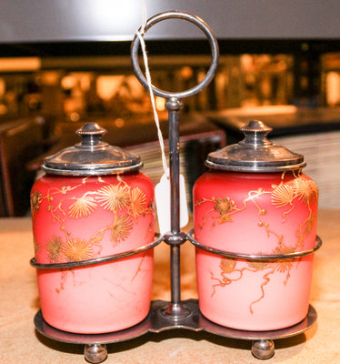 with two gilt-decorated covered jars and raised on ball feet.