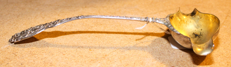 the handle decorated with a portrait of a young man, the ladle having spouts on the bowl's sides.