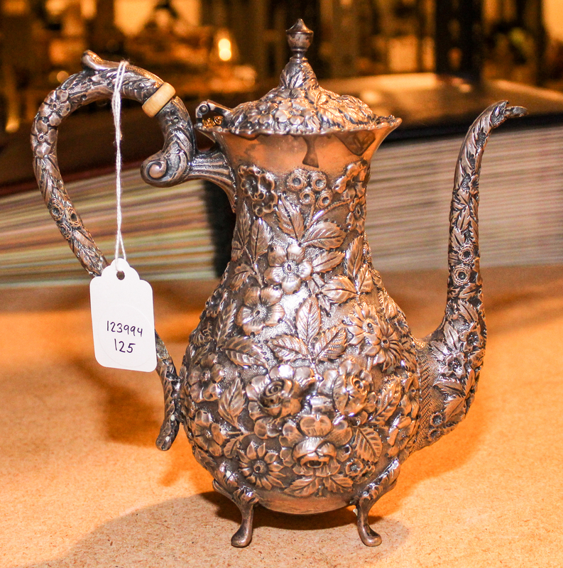 having an urn finial, the body decorated with floral and foliate repousse decoration throughout.