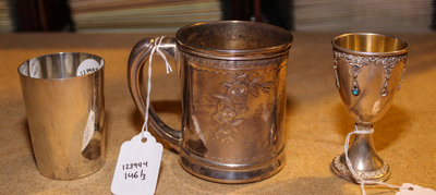 comprising a Whiting mug, an American silver beaker and an Israeli silver cup decorated with wirework and inlaid stones.
