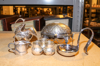comprising a sugar, scoop and fork, butter dish, curved ladle, three-pot condiment dish and others.
