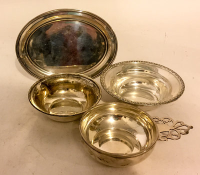 various makers, comprising two bowls, a porringer and oval tray.