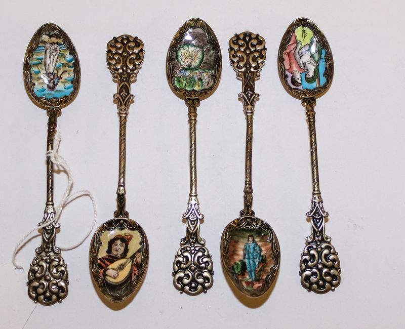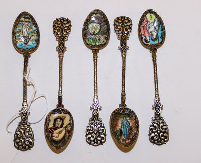 A Group of Five Continental Enameled Silver-Plate Spoons