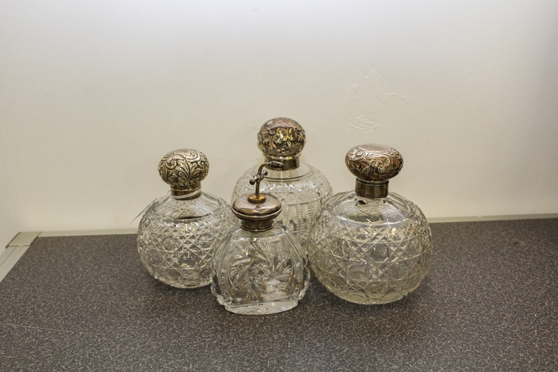A Group of Three English Silver and Cut Glass Perfume Bottles
