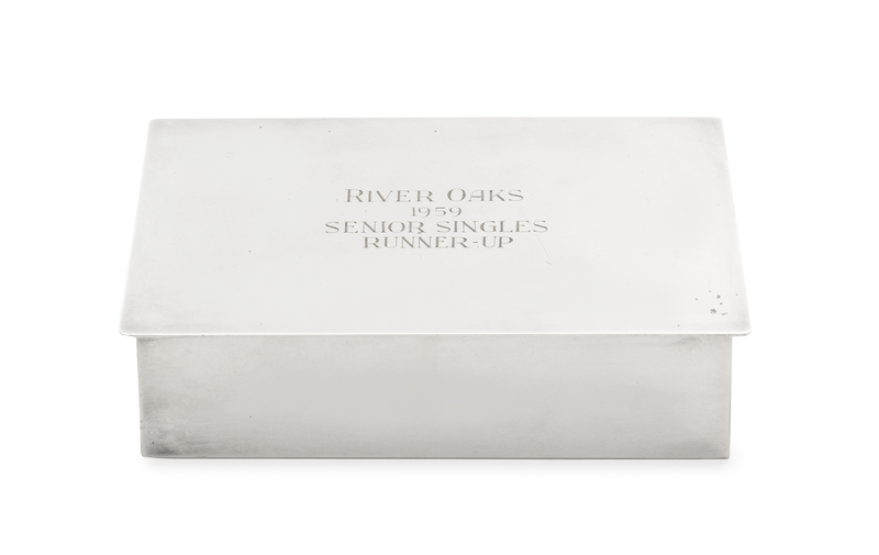 of rectangular form, the hinged cover later engraved RIVER OAKS 1959 SENIOR SINGLES RUNNER-UP and opening to a wood lined interior.