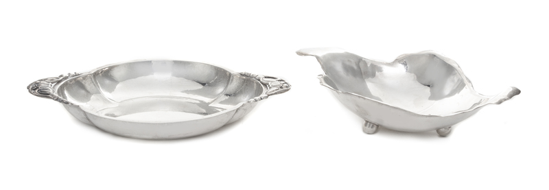 one example of shaped oval form having openwork flower and beaded tendril handles, The Randahl Shop, Chicago, IL, 1940, the other of stylized leaf form raised on three ball feet, Alfredo Sciarrotta, Newport, RI, 1960.