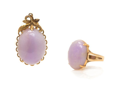 consisting of a 14 karat yellow gold ring containing one oval cabochon cut lavender jade measuring approximately 20.20 x 14.49 mm together with a pendant containing one oval cabochon cut lavender jade measuring approximately 24.00 x 18.86 mm.Ring stamp: 14K.