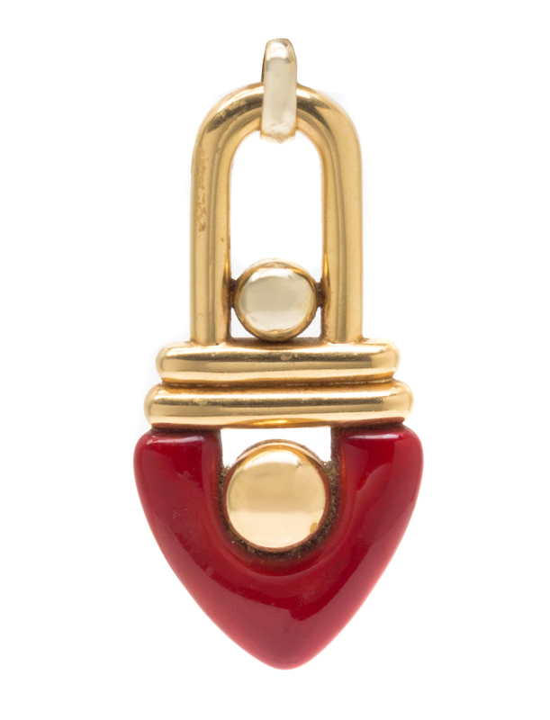 consisting of red enamel accent overlay, pendant measures approximately 62.00 x 28.00 mm.Stamp: la NOUVELLEBAGUE 750 18Kt.