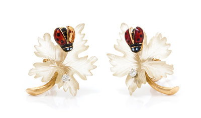 in a ladybug and leaf motif, containing two carved rock crystal leaves surmounted by two red and black enameled ladybugs and two round brilliant cut diamonds weighing approximately 0.10 carat total. Stamp: 14K.