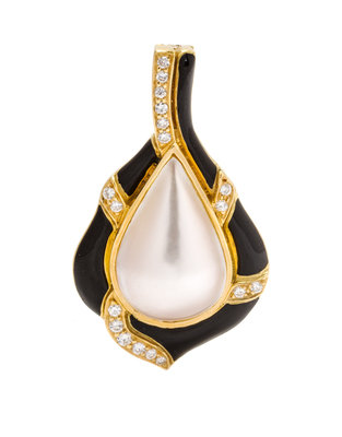 containing one pear shape mabe pearl measuring approximately 22.20 x 14.43 mm, 18 round brilliant cut diamonds weighing approximately 0.28 carat total, and black enamel.Stamp: 18 KT La Triomphe (maker's mark).