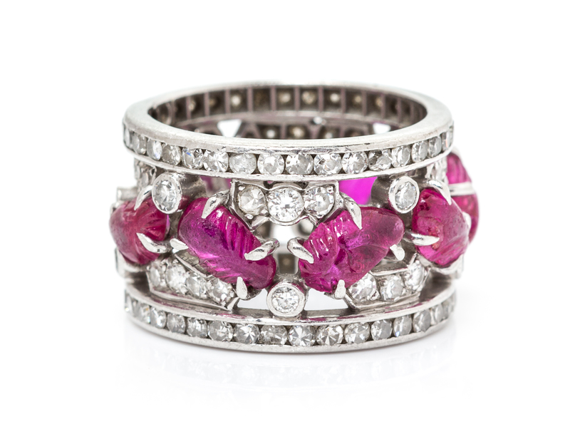 retailed by Fred Leighton, containing 117 round brilliant and single cut diamonds weighing approximately 1.76 carats total and eight carved rubies in a leaf motif.