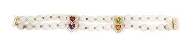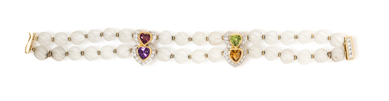 consisting of two strands containing numerous carved frosted crystal beads strung with two heart motif spacer bars containing four heart shape brilliant cut peridot, citrine, amethyst and garnet and 39 round brilliant cut diamonds weighing approximately 0.58 carat total with a yellow gold slide clasp.Stamp: 18K 750.