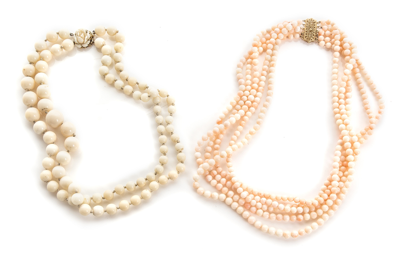 consisting of one necklace with two strands of white coral beads measuring approximately 6.22-13.34 mm in diameter strung knotted with a 14 karat yellow gold clasp containing a carved white coral rose, together with a multistrand necklace consisting of five strands of angelskin coral beads measuring approximately 4.52-5.00 mm in diameter strung with an 14 karat yellow box clasp.Stamp: 14KG. Stamp: 14K.